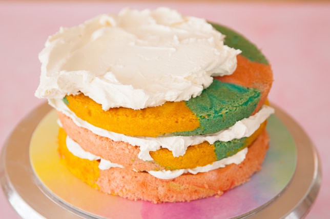 Step One: Divide your cake batter evenly into three medium bowls. Using gel food colouring, make pink, blue and yellow cake batter by folding the gel colour gently into each bowl.