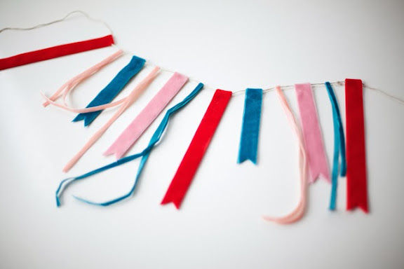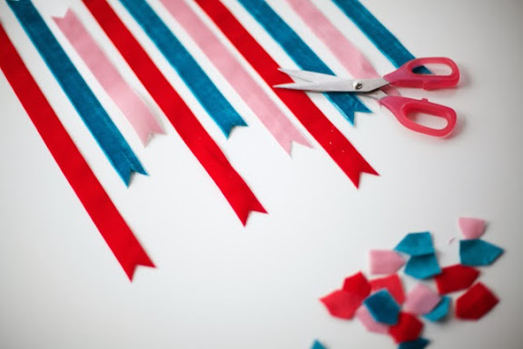 It’s hard for me to resist making a garland. So here are two very easy ones to jazz up your heart day (or any day!) party: craft paper letter “LOVE” and super cute velvet ribbon garland. The “LOVE” garland was made by free-style cutting letters out of craft paper and adhering to twine with washi tape. The ribbon garland was made by cutting ribbon to varying lengths, using glue (I used a glue gun) to adhere both the ribbons together and attach to twine and cutting a v-point on the ends to finish them. I used the ribbon bits that were cut away as table confetti, too! See below!