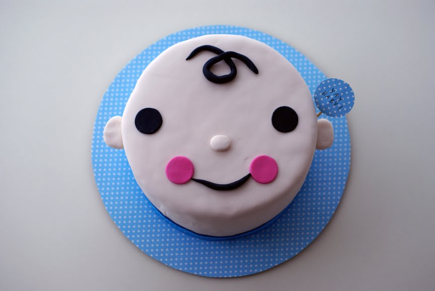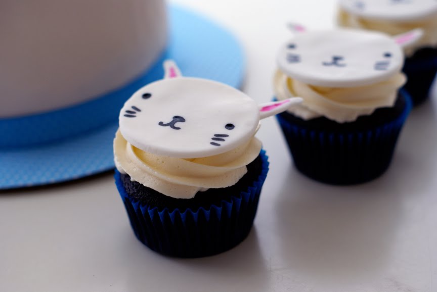 Alice is having a cute little baby boy born in the Year of the Rabbit… so she requested a cute little baby boy face cake in chocolate with vanilla buttercream and raspberry jam filling, and bunny rabbit faced cupcakes to match for her baby shower! Kawaii cute!