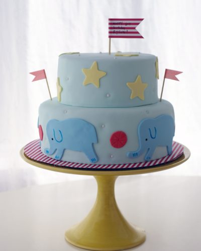 Cute two tiered vanilla cake with CIRCUS theme! Blue elephants, red stripey and yellow stars… Happy Birthday Ryson!