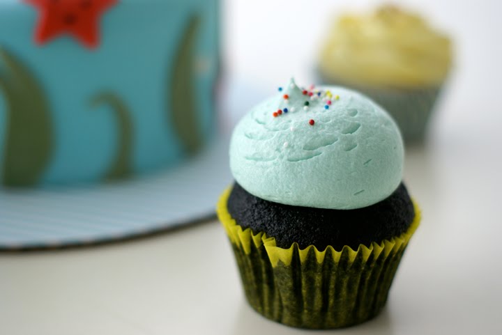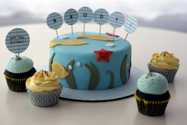 Brody! You turned 3 years old! What the heck! And you love fishies, and underwater stuff, and anything to do with the ocean and the aquarium!! So Auntie Coco Cake made you a fish themed vanilla birthday cake and matching vanilla and chocolate cupcakes in a yellow and blue stripey motif! And you had a blast and a half at your birthday partying it up in the gymnasium, ripping around in mini cars and climbing over jungle gyms and crawling through makeshift tunnels made of puffy oversized coloured blocks, then eating up your cheese and crackers and pieces of apple and carrots and stuff. And then the whole room sang Happy Birthday to you and you smiled, blew out the candles (sort of) and licked the frosting off a vanilla buttercream topped cupcake and it made Auntie Coco Cake very happy!