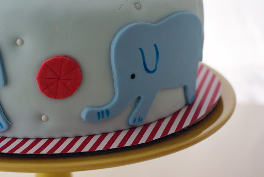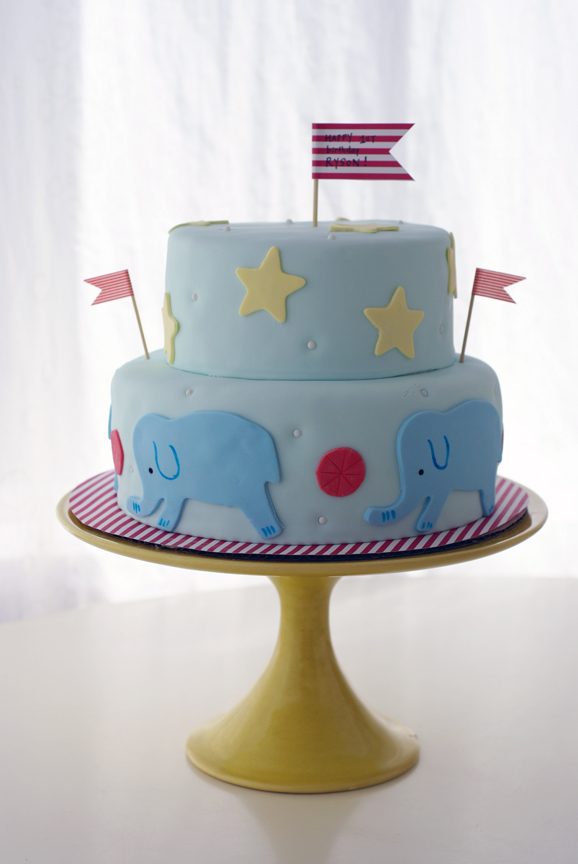 Cute two tiered vanilla cake with CIRCUS theme! Blue elephants, red stripey and yellow stars… Happy Birthday Ryson!