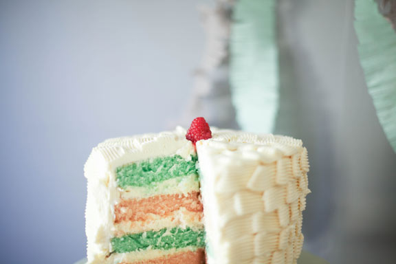 I love this – both the cake and the crepe paper banner! Using the basketweave tip in an original way created a great texture!