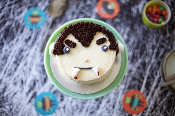 I know Halloween is supposed to be scary. But I just can’t get into the super gory cakes and terrifying stuff – I prefer my Halloween light and bubbly with some cuteness thrown in… so I decided to make a “Coco Cake Land” version of a Dracula cake. It turned out pretty cute I think! Perhaps it looks a little more like Eugene Levy than I expected… but I like his hairy dark chocolate widow’s peak and cutely evil face!