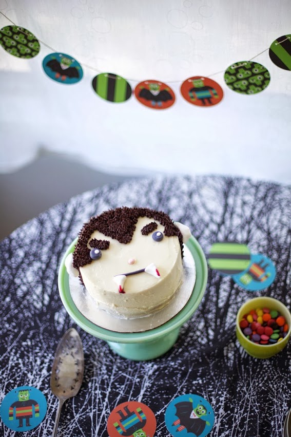 You did it! Now that you’ve made your Cute Dracula cake, it’s time to throw a party! Look at this adorable Halloween paper garland I got from Minted: cartoon Dracula, Frankenstein and non-threatening skull faces – perfect for a stylish kiddie Halloween party. I always think a garland is a party waiting to happen. Such simple decor but with visual (and easy!) impact!