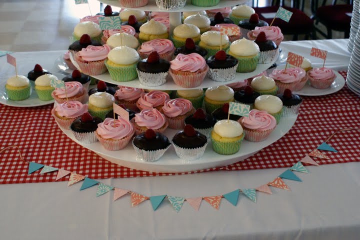 In addition to the cupcakes, I also made a sweet little buttercream frosted, fresh-raspberry filled cutting cake for the top tier of the cupcakes, dozens of pretty little mini flags, and, as requested by the bride, two handmade bunting(s?), one large and one mini! Ahhhdorable!