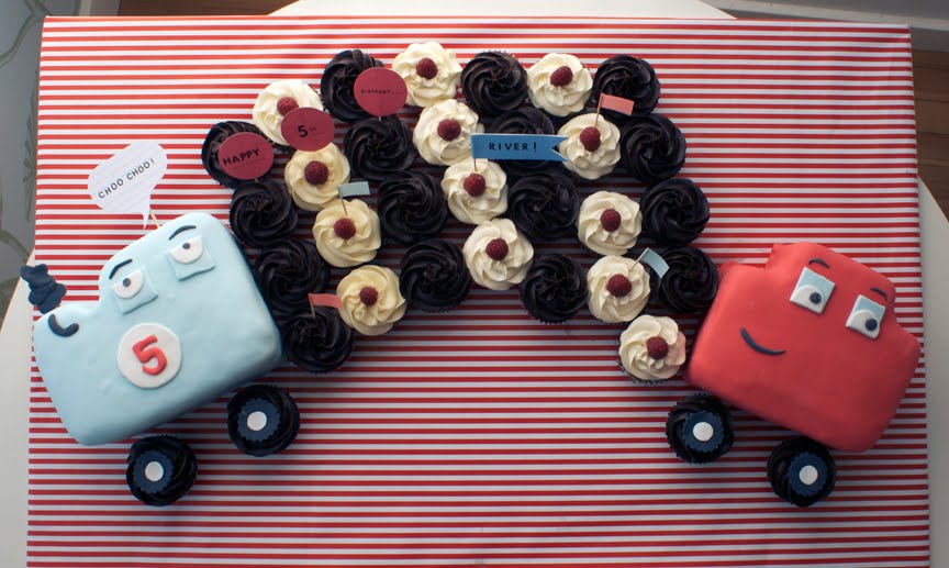 Lookit this cutie pie train cake I made for River’s 5th birthday party! I have been so lucky to make many delightful cakes and cupcakes for this lovely family’s birthday parties. This might be on of my favourites thusfar though… I think it’s due to the cute little faces on the engine and the caboose, and the cute red, blue, brown and white colour theme!